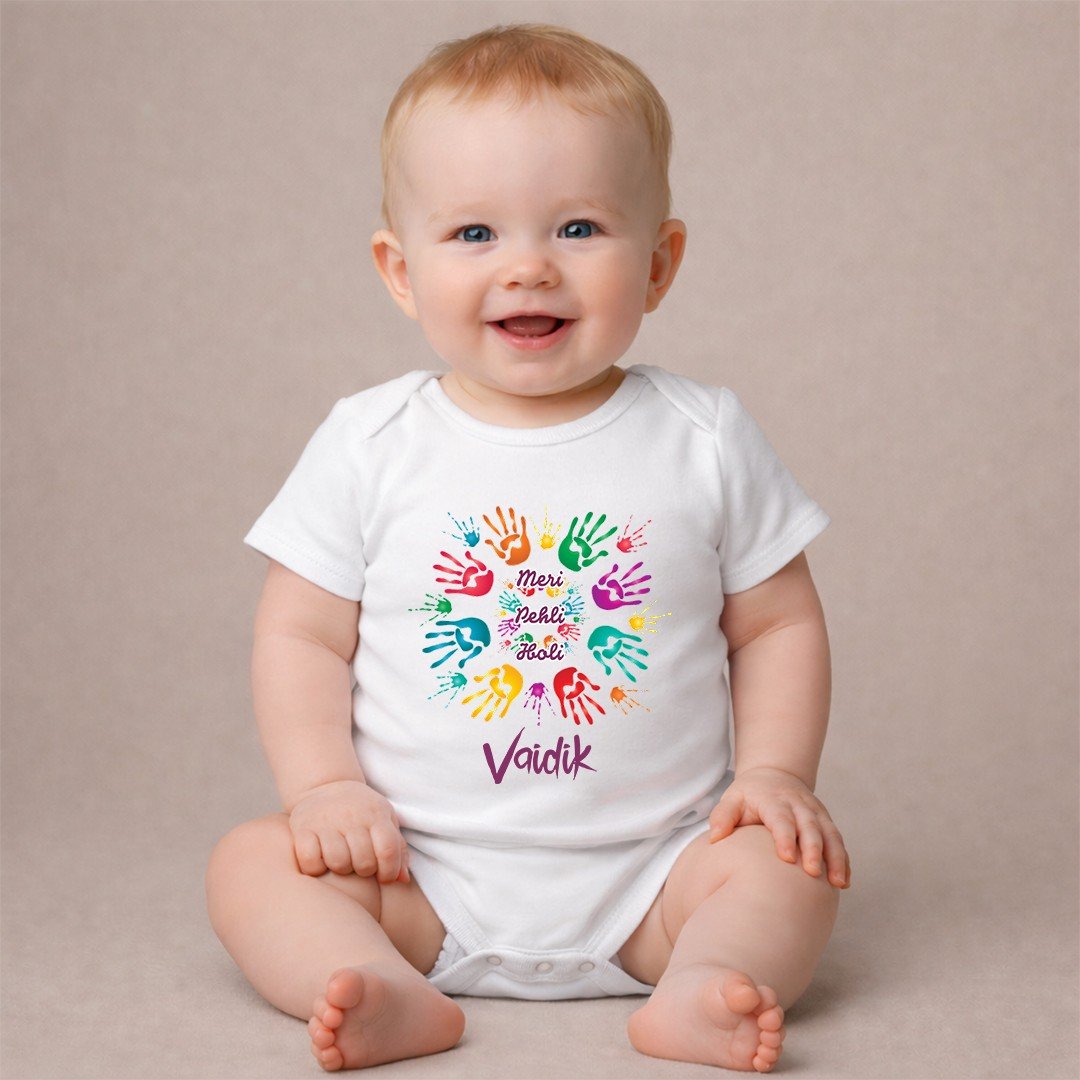 Custom 1st Holi Baby Bodysuit with Name - CottonCustom 1st Holi Baby Bodysuit with Name – Cotton
